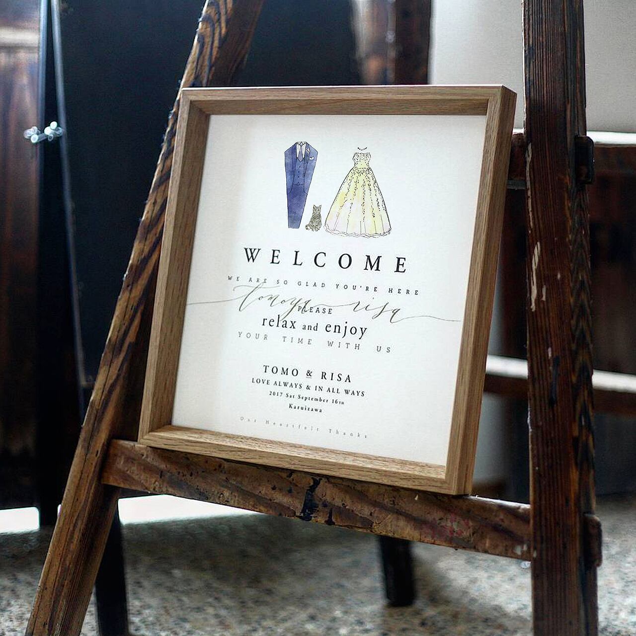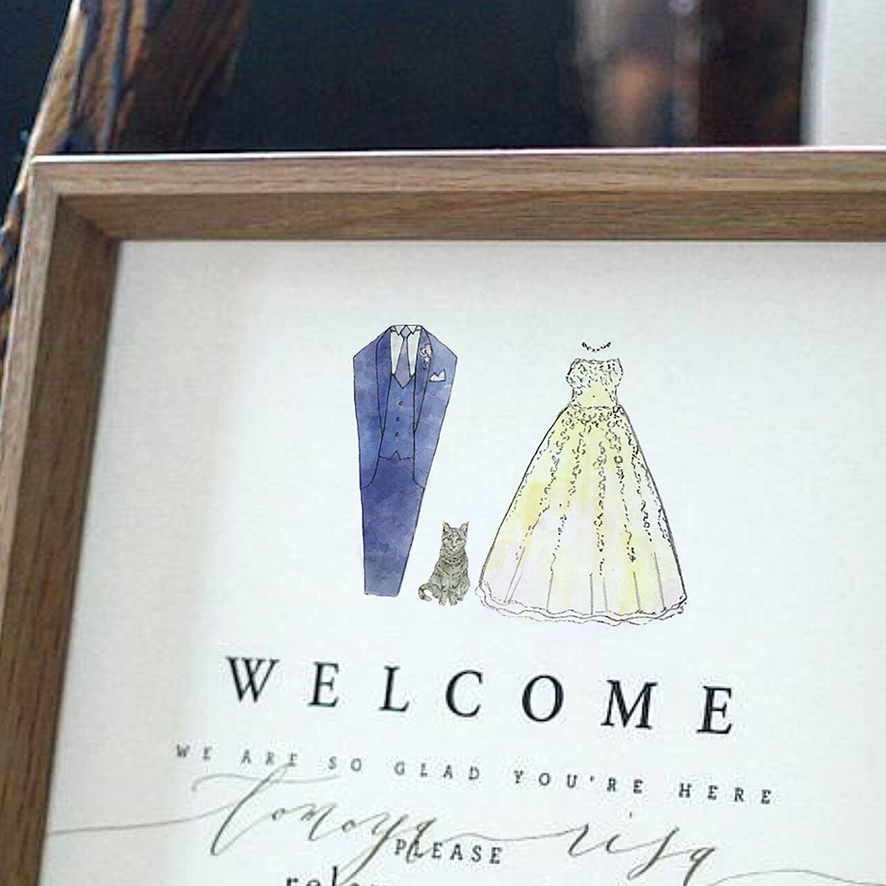 結婚式を控えたおふたりの当日のドレスとタキシードをお描きします。